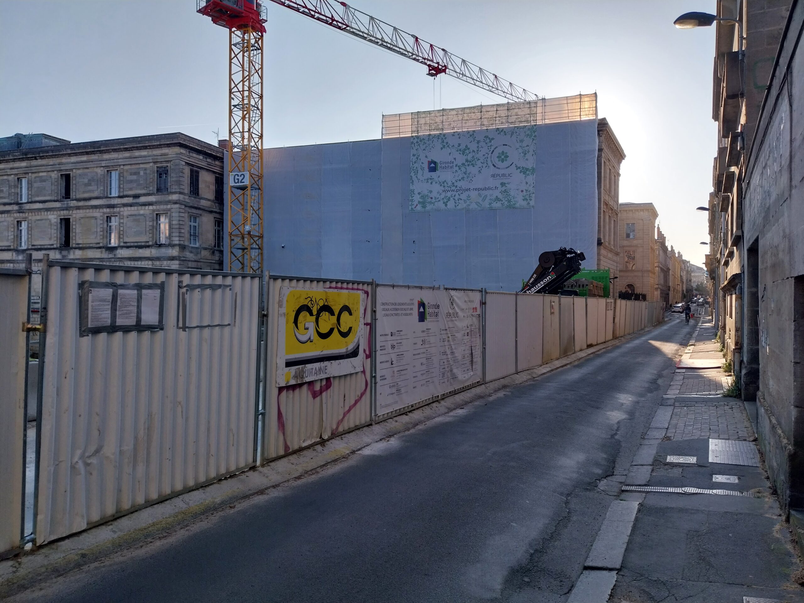 En images : finalisation du ravalement de la façade et démarrage des travaux de plâtrerie dans le bâtiment ancien. A l’arrière, la voie nouvelle se dessine entre les deux ensembles. Celle-ci sera piétonne et ouverte à tous, permettant de réouvrir l’ilot sur son environnement.  …
