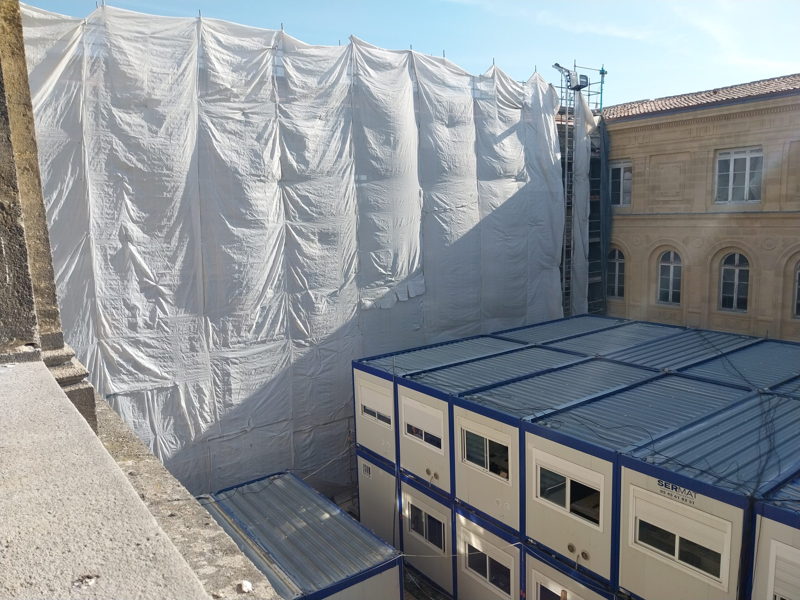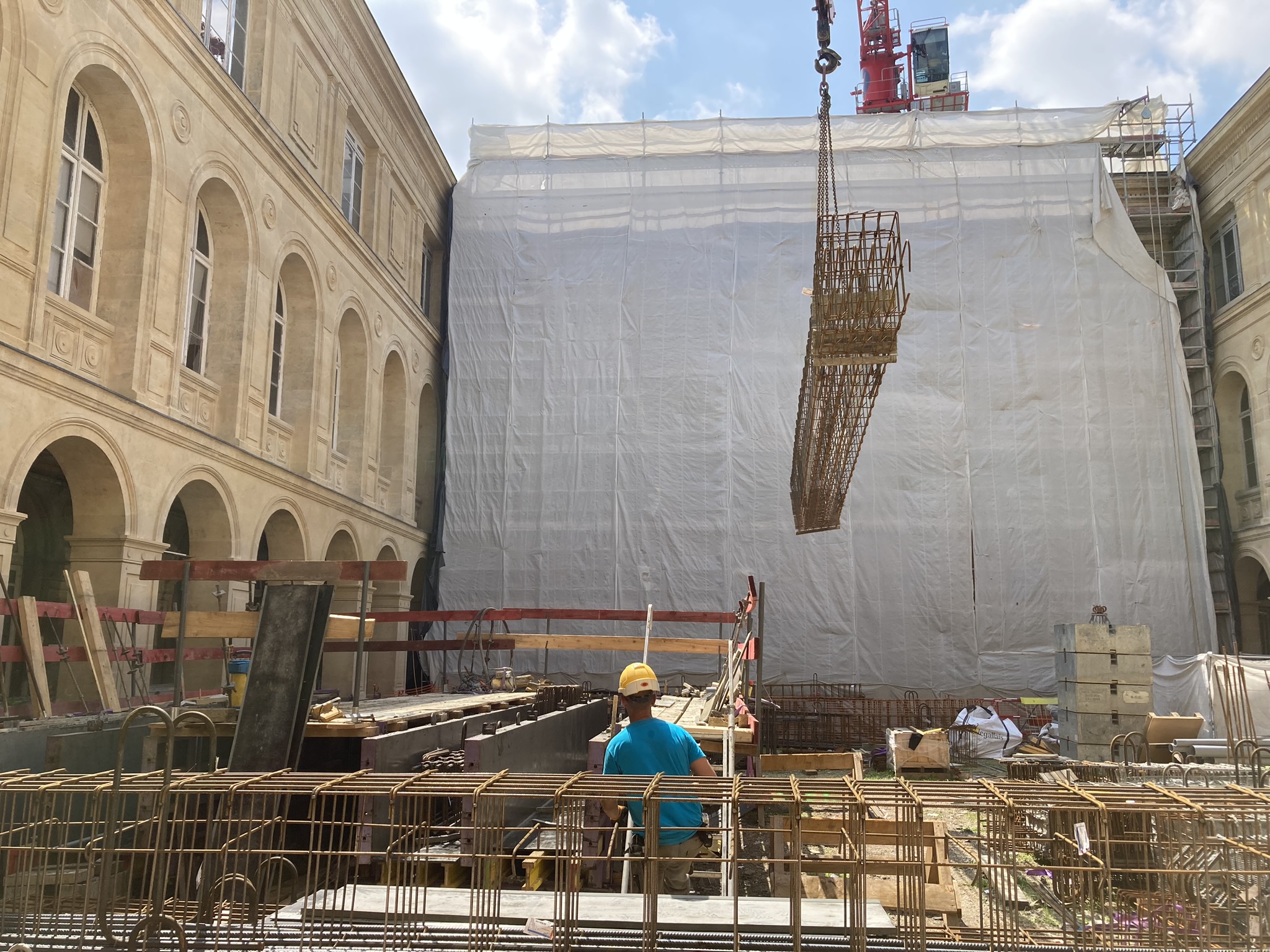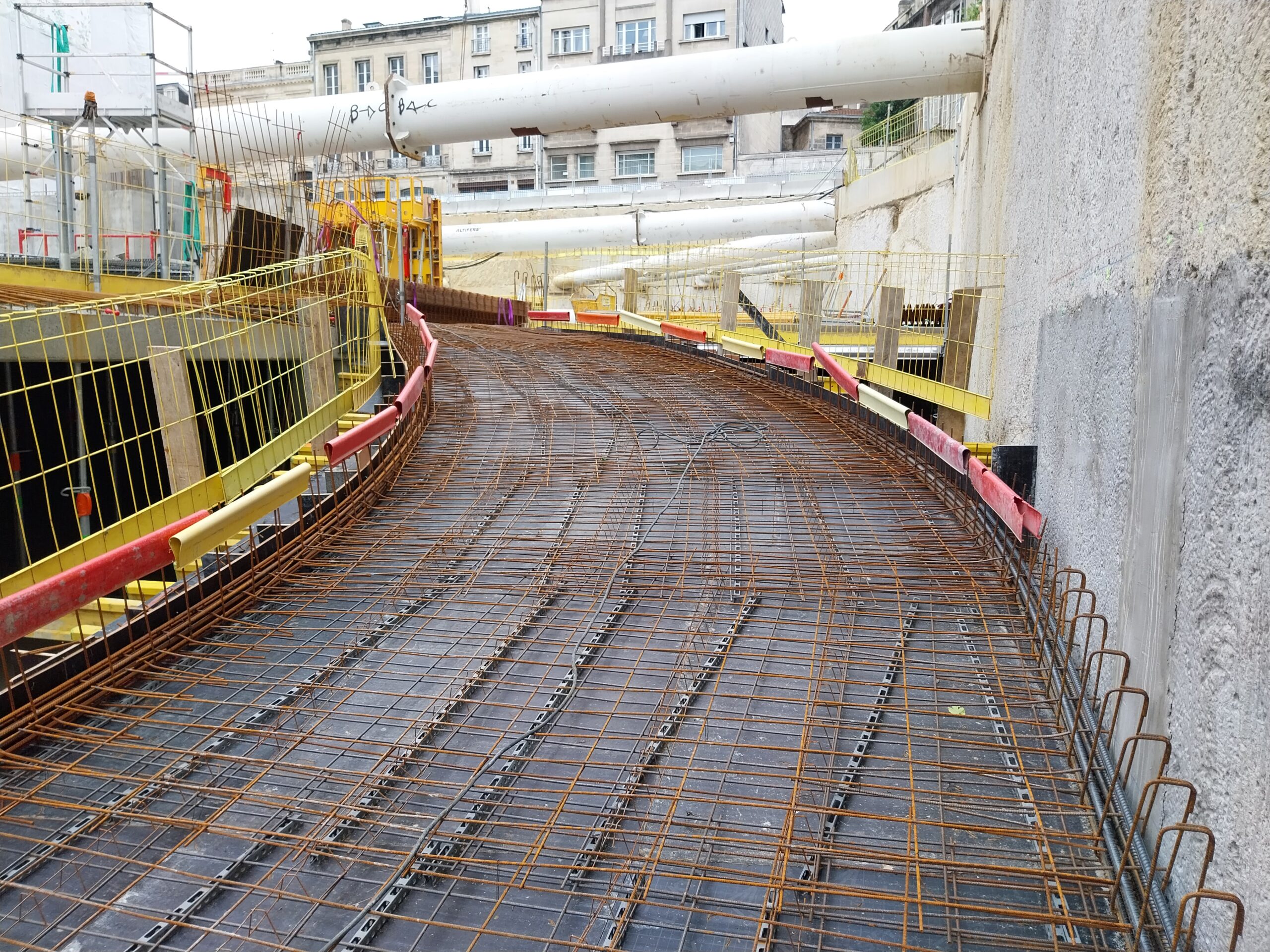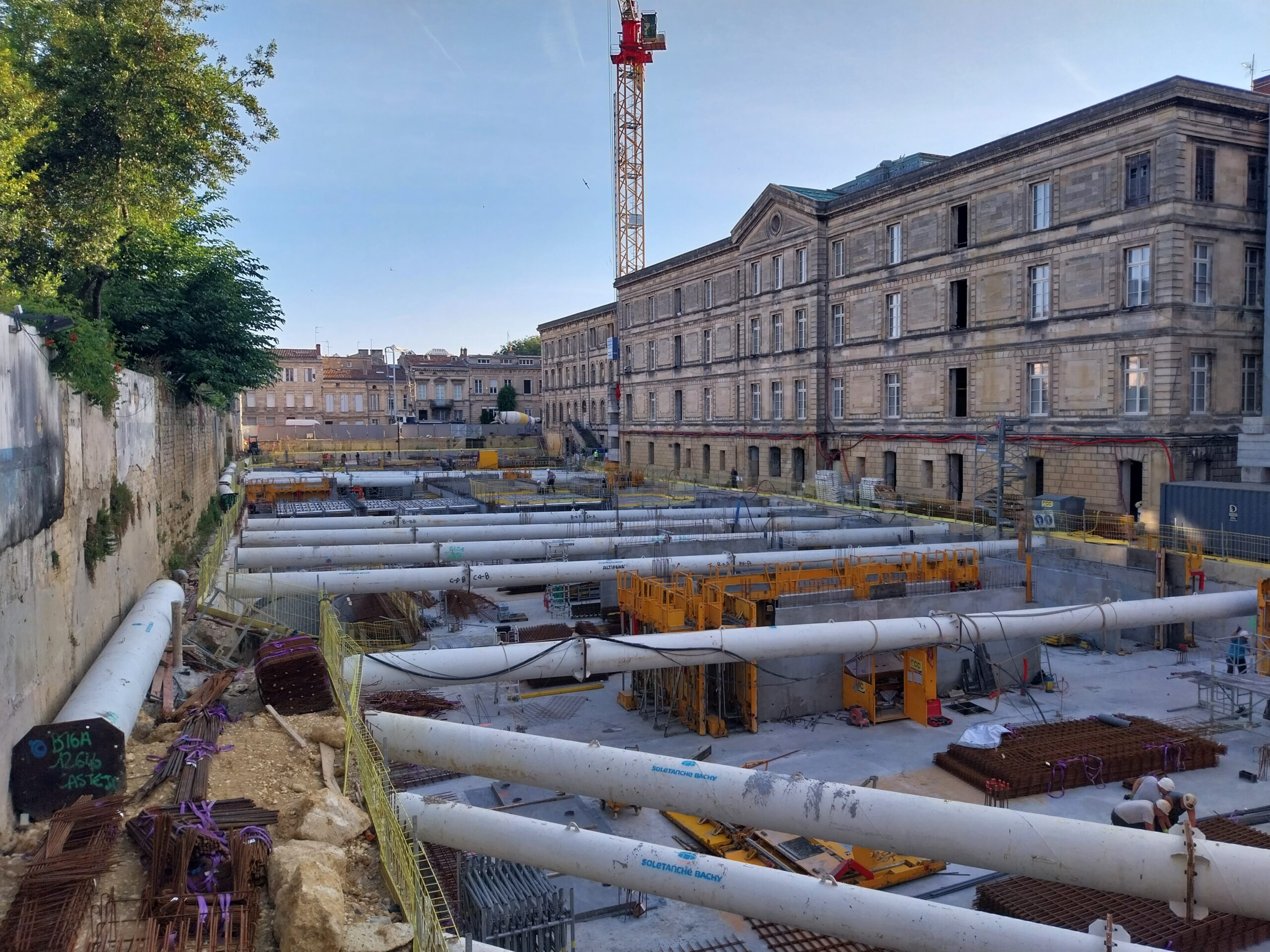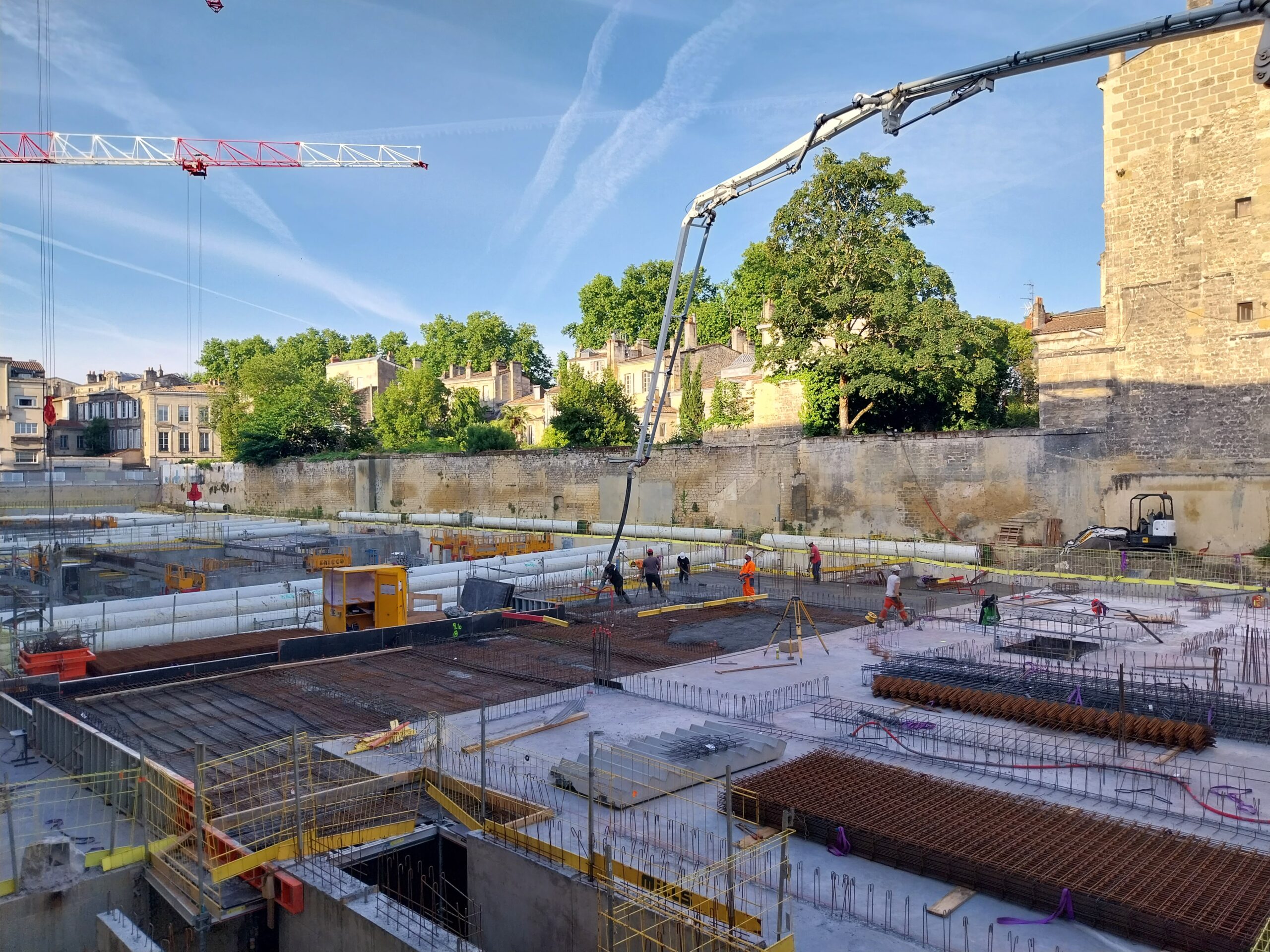 En images : les coulages des planchers du futur parking, et ferraillage de la future rampe, le ravalement de façade de l’arrière du monument historique, côté voie nouvelle, qui va durer tout l’été parallèlement à celui de la rue Thiac.
