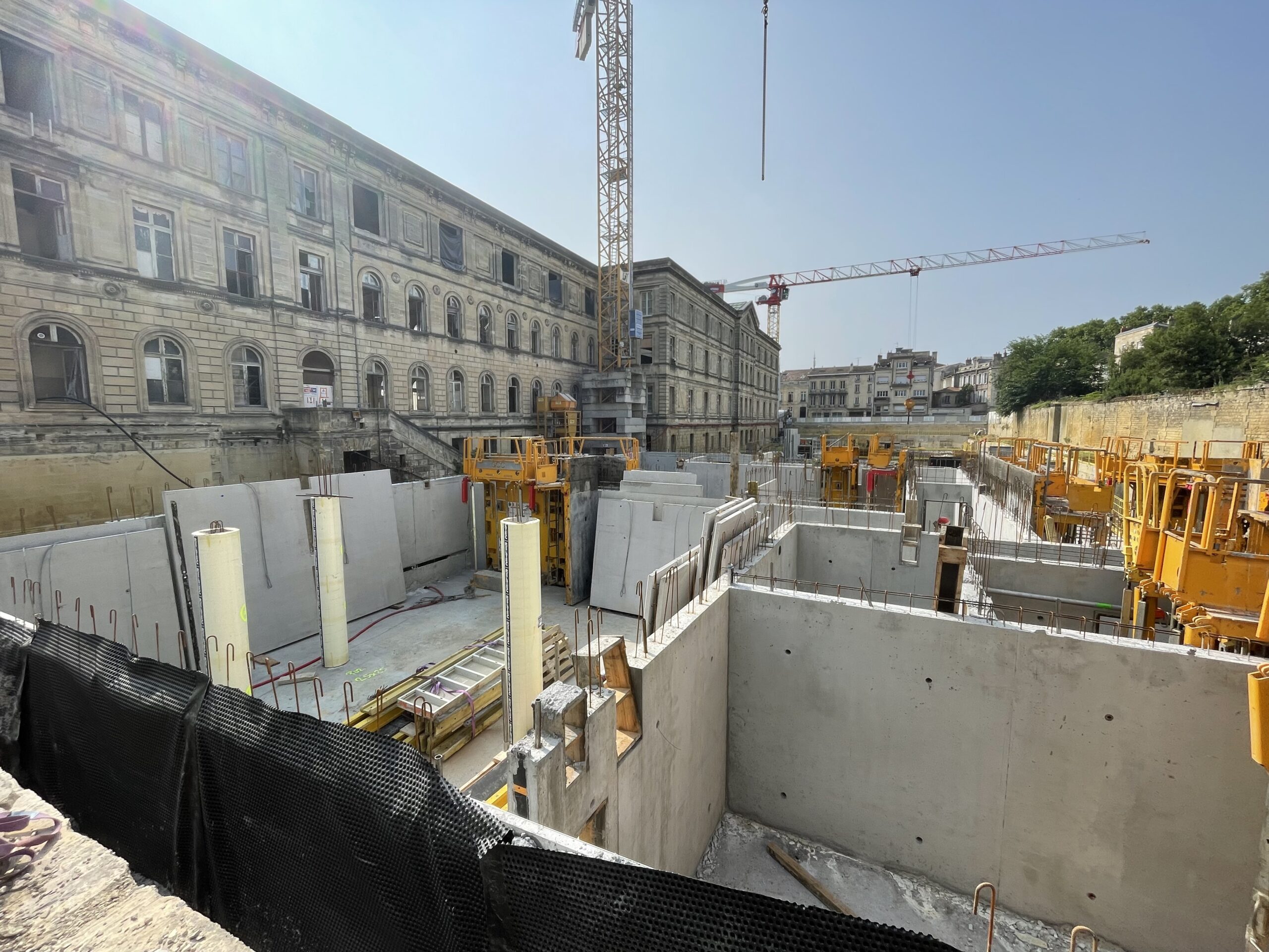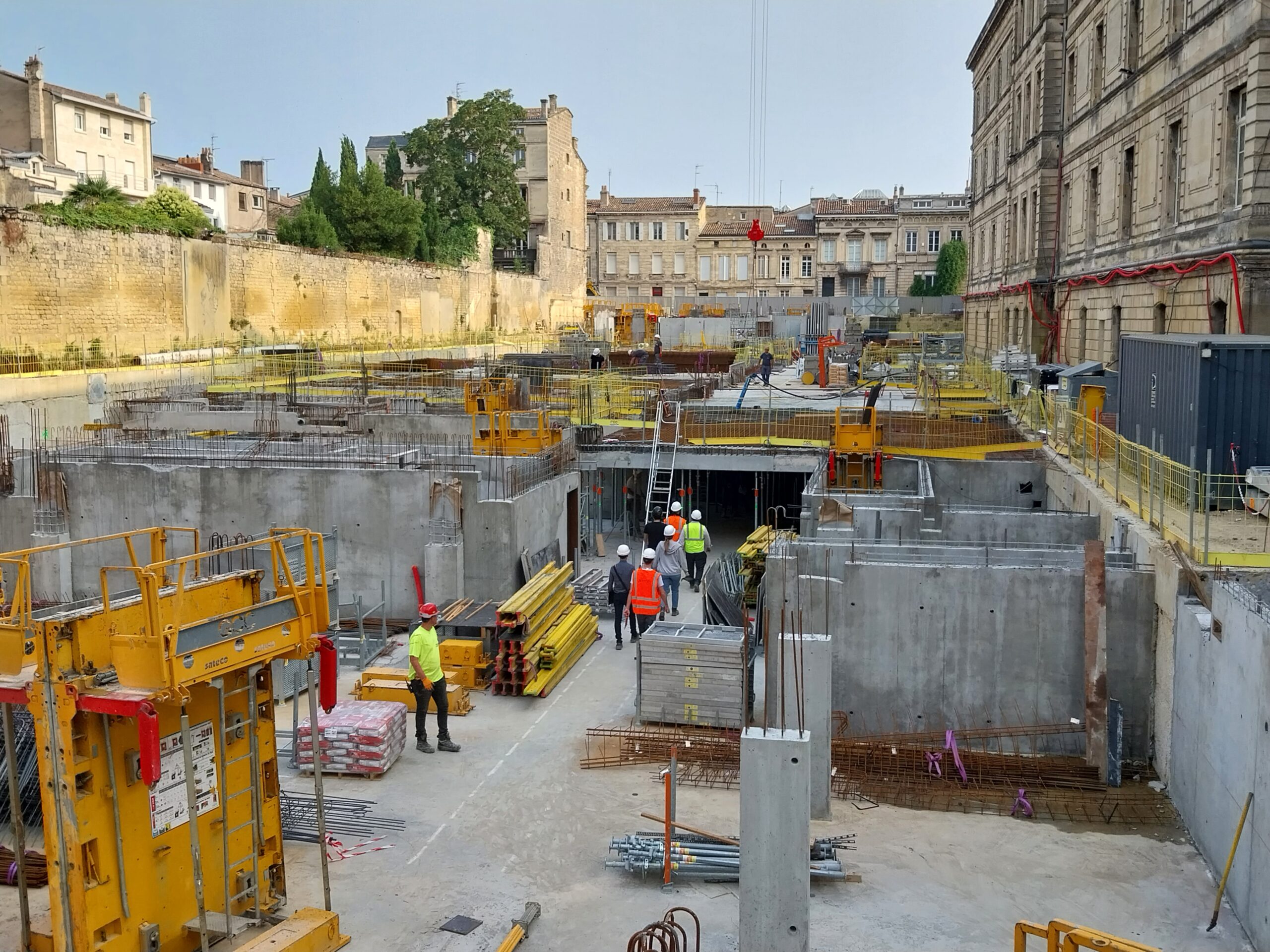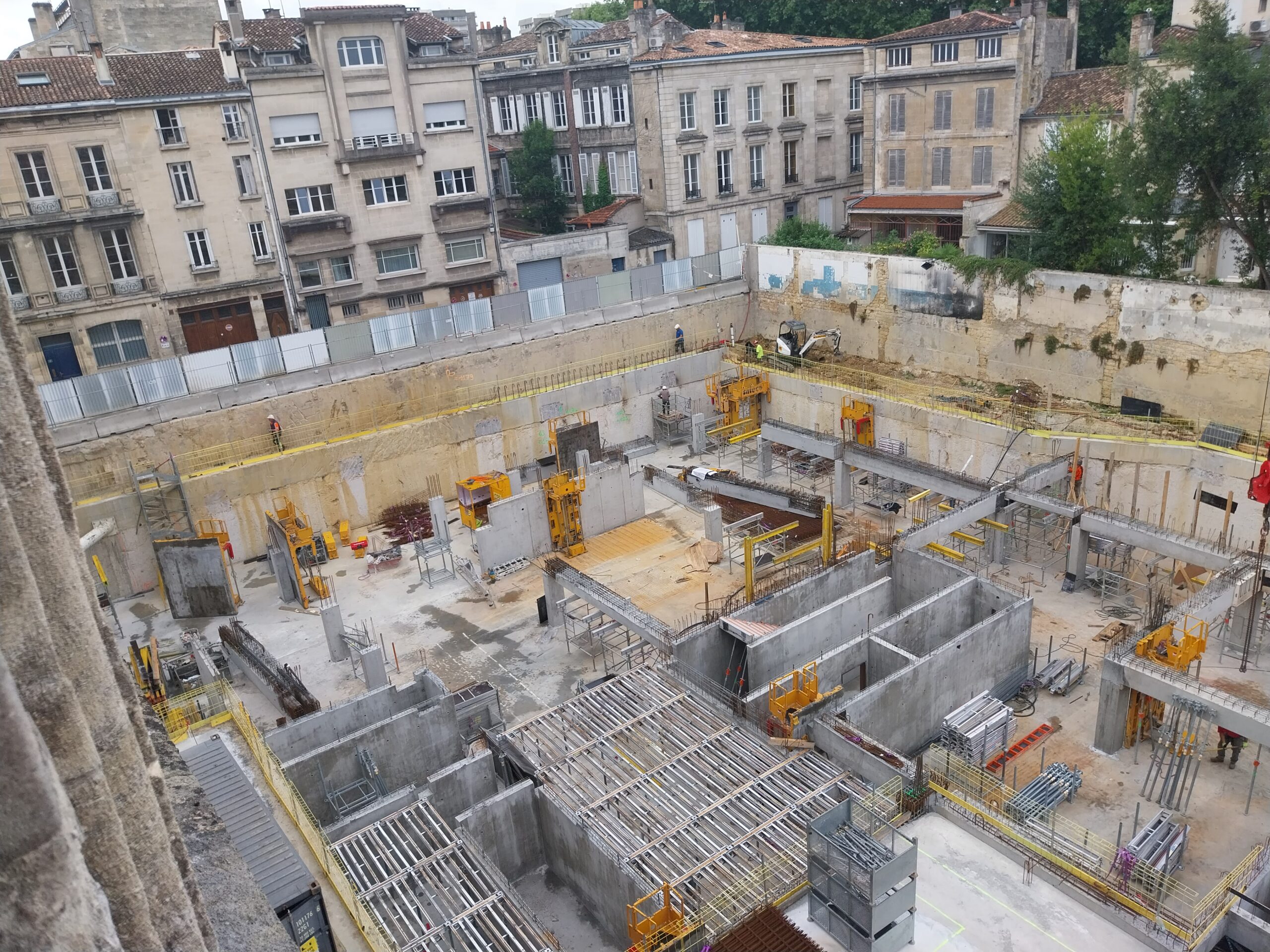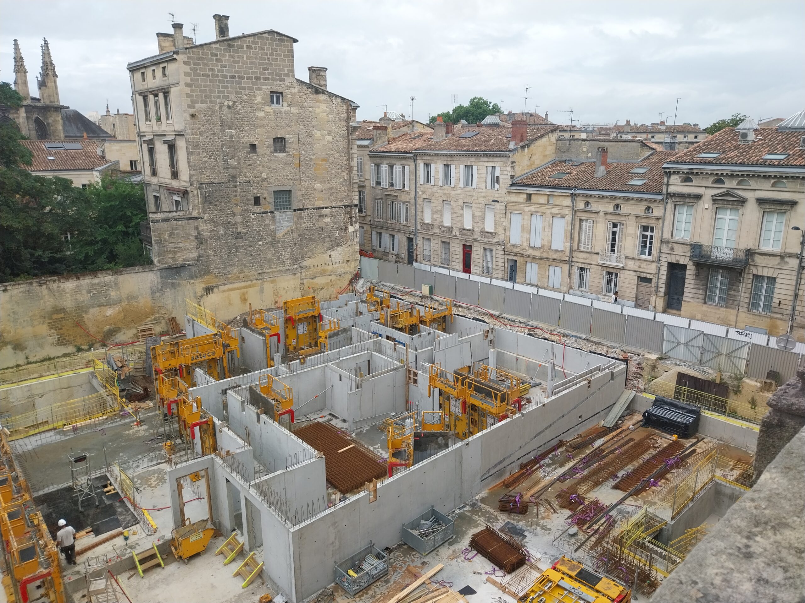 - à l’arrière : finalisation de la dalle du rez-de-jardin (qui sera le niveau de la future voie traversant le projet Républic) et démarrage de la construction des murs côté rue Thiac.