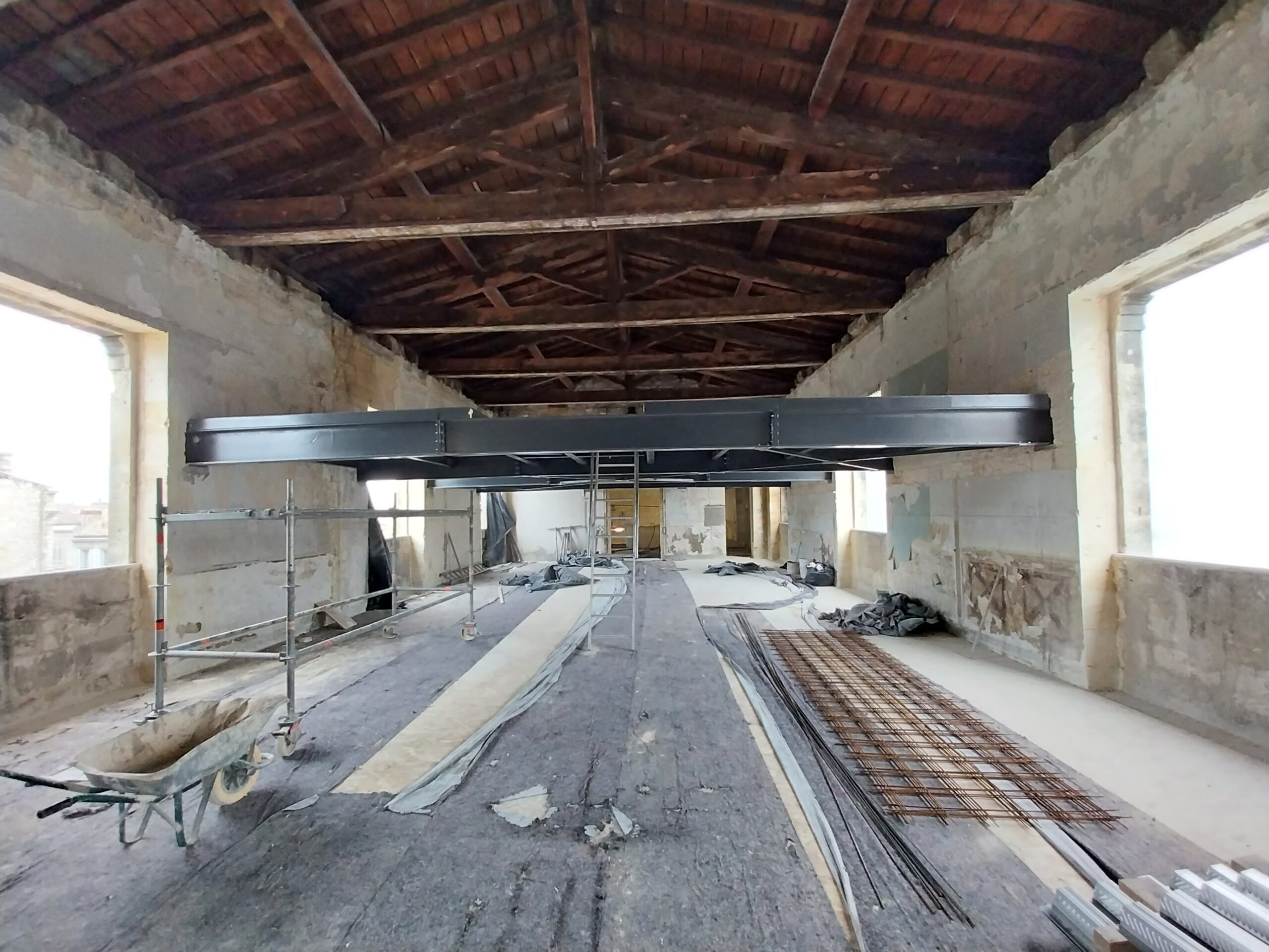- dans le bâtiment ancien : mise en place des structures métalliques dans les futurs duplex et poursuite de la réfection des planchers. Les échafaudages sur le bâtiment côté cour d’honneur ont été retirés, découvrant ainsi la magnifique façade principale et la statue de l’Abbé de l’Epée rénovée.