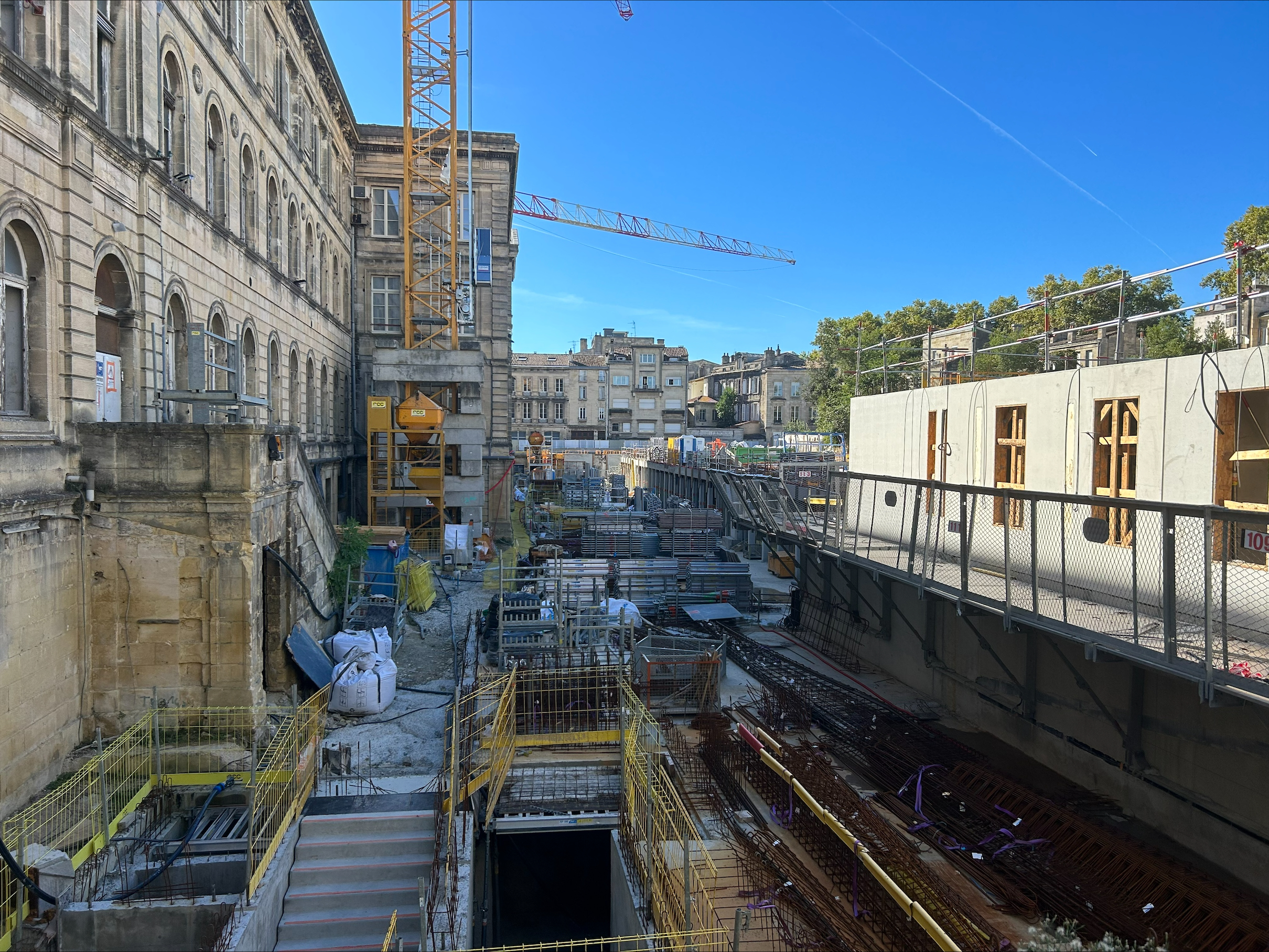 Nous retrouvons en images l’avancement du chantier cet été : dans la partie neuve : avancement de la structure (fin du coulage du plancher bas niveau rez-de-chaussée prévue pour fin octobre 2023), raccordement eau usée et eau pluviale. dans la partie monument historique : finalisation…