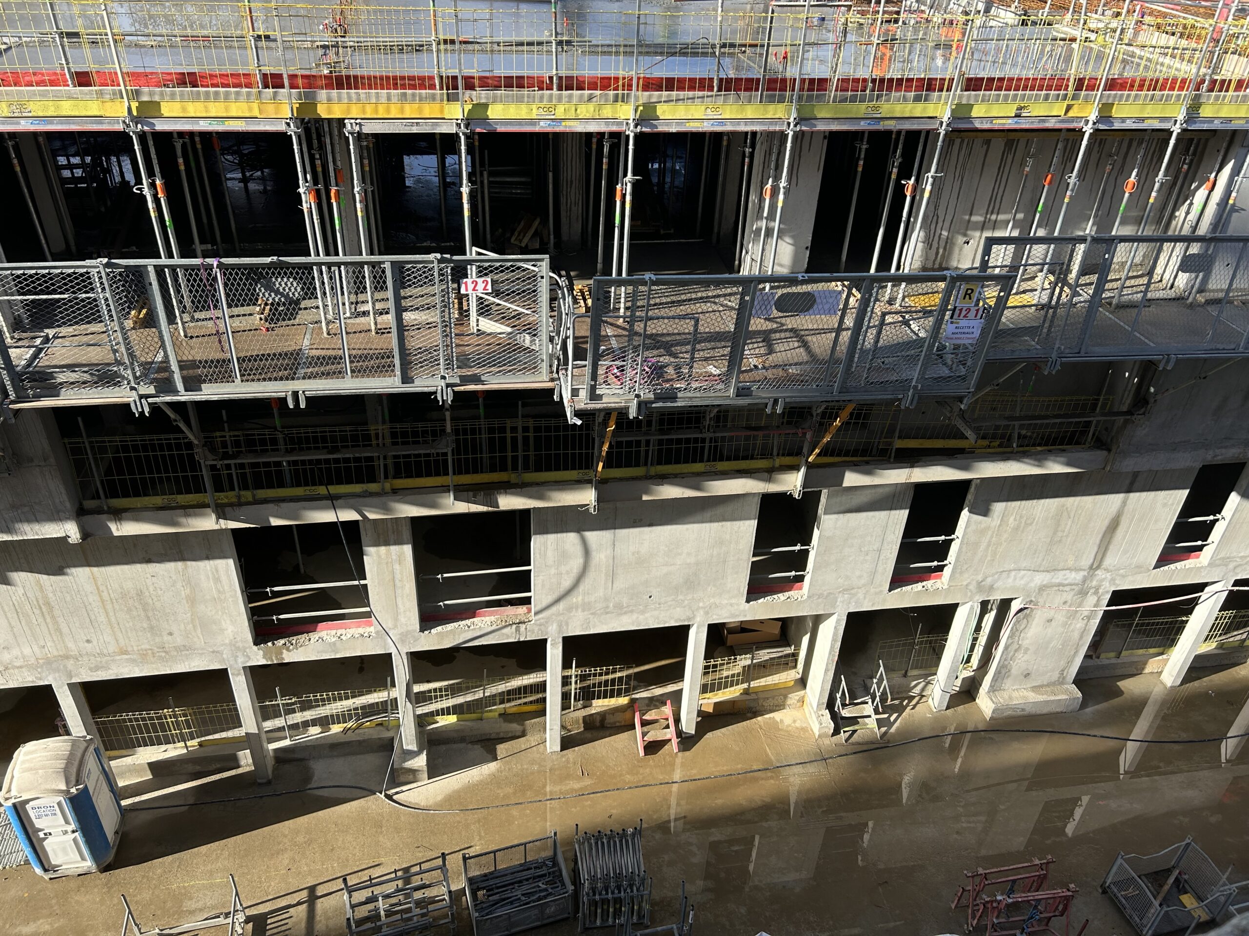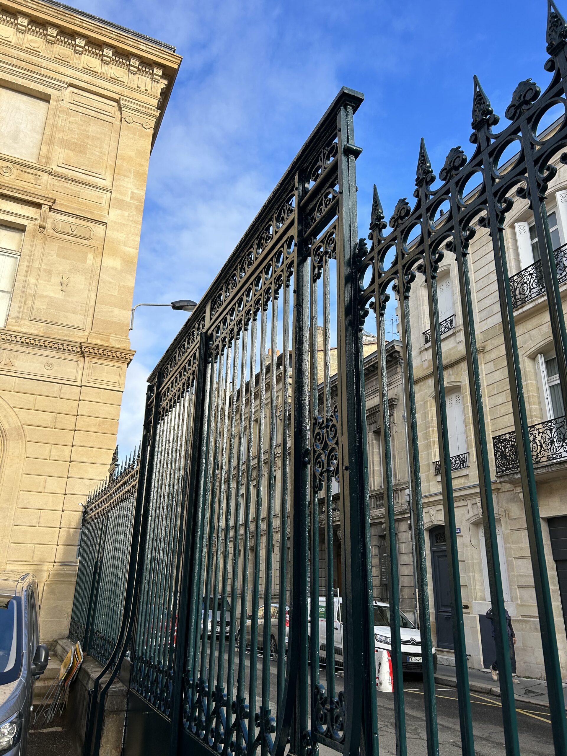 En images : la rénovation du portail et le retour à sa couleur d’origine, la fin du coulage des voiles du rez-de-jardin et vue par dessous de la rampe du parking souterrain.