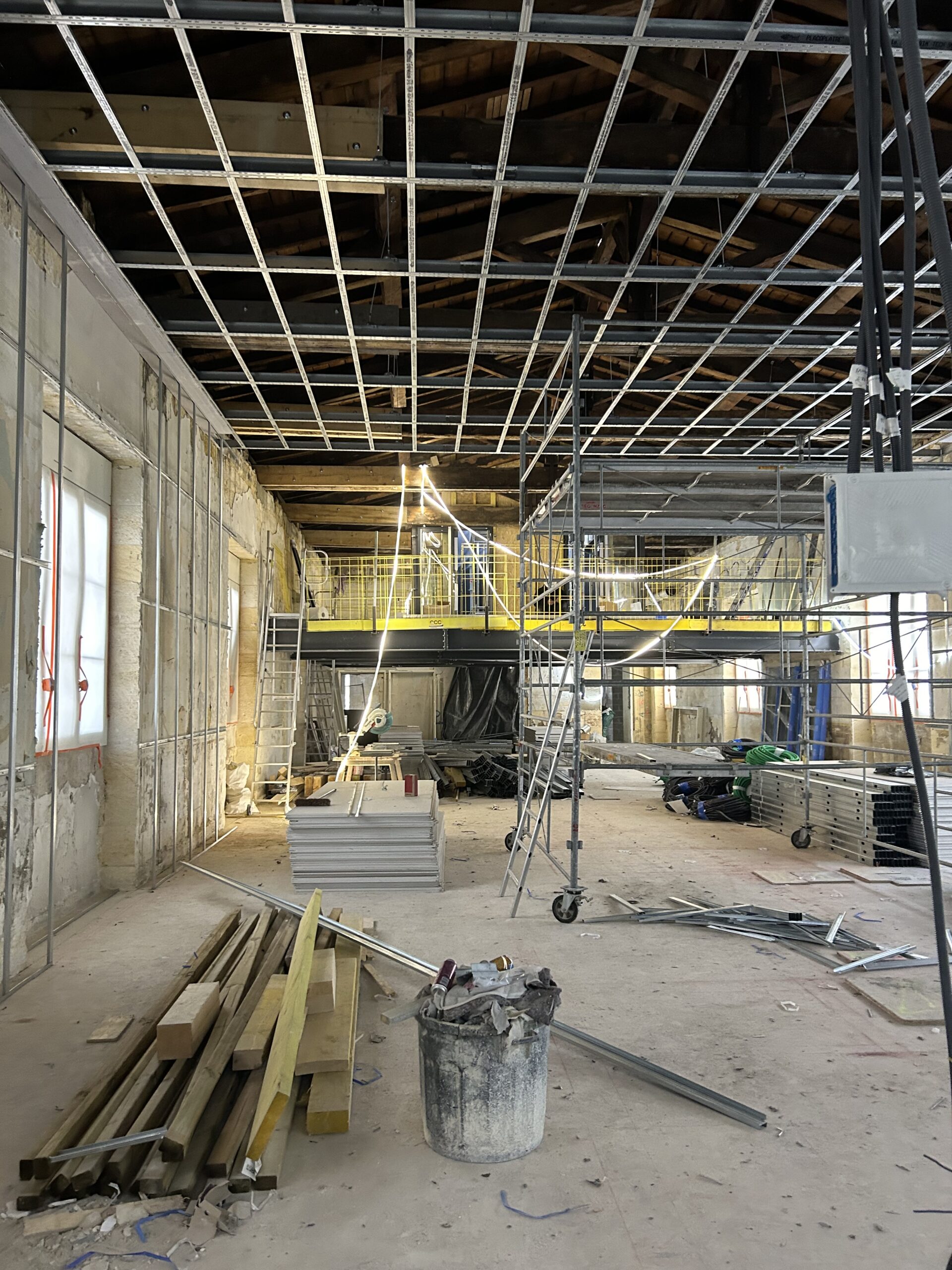 Nous retrouvons en images l’avancement du chantier cet été : dans la partie neuve : avancement de la structure (fin du coulage du plancher bas niveau rez-de-chaussée prévue pour fin octobre 2023), raccordement eau usée et eau pluviale. dans la partie monument historique : finalisation…