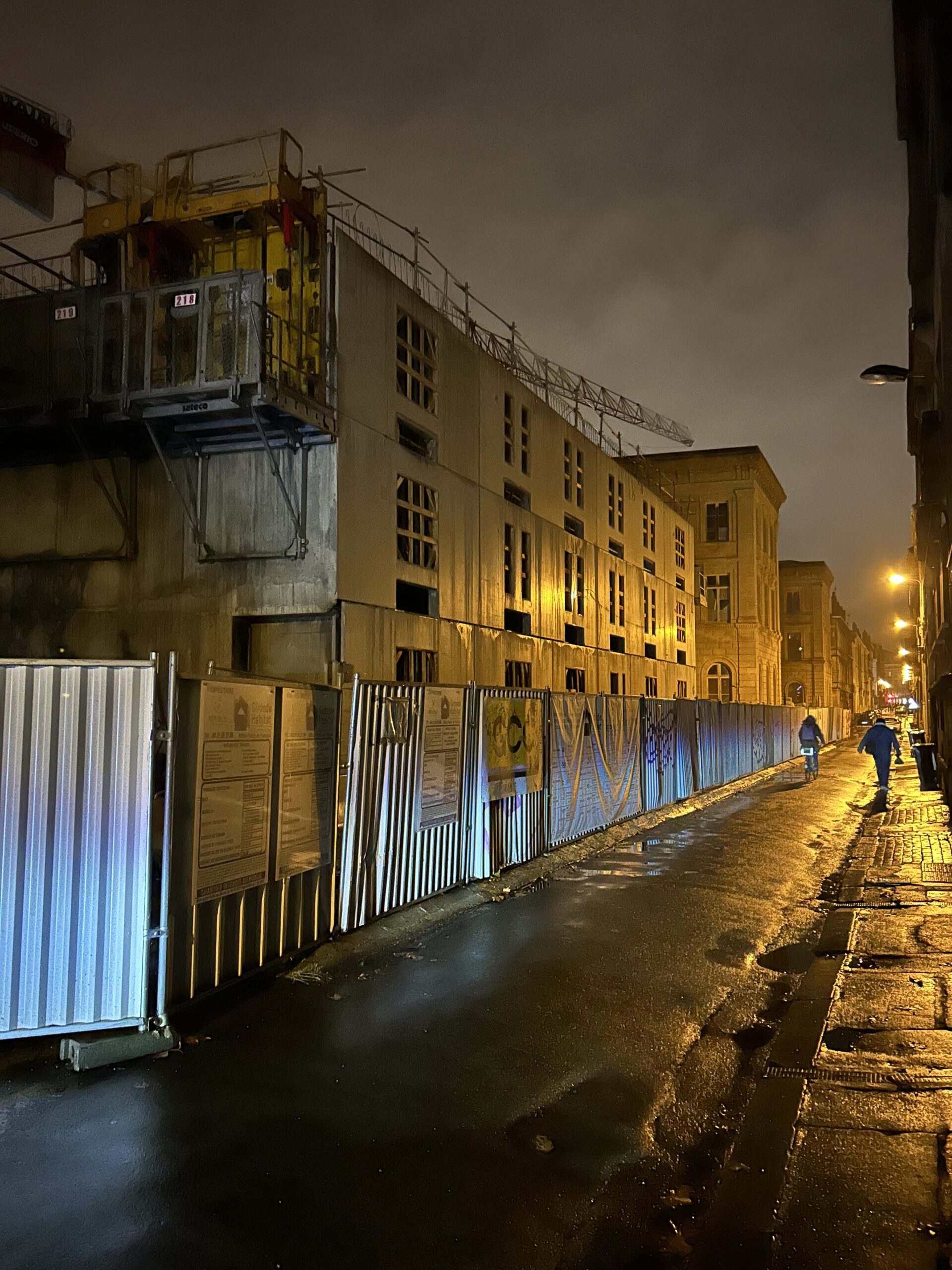 En images : finalisation du ravalement de la façade et démarrage des travaux de plâtrerie dans le bâtiment ancien. A l’arrière, la voie nouvelle se dessine entre les deux ensembles. Celle-ci sera piétonne et ouverte à tous, permettant de réouvrir l’ilot sur son environnement.
